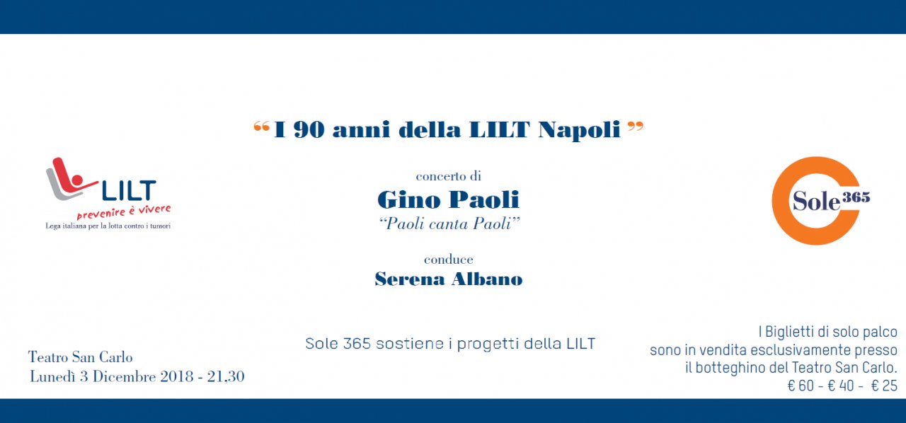Lunedì 3 dicembre, nella splendida cornice del Teatro San Carlo, festeggeremo i 90 anni della LILT Napoli con un concerto di uno dei miti della musica italiana e internazionale: Gino Paoli (presenta Serena Albano).