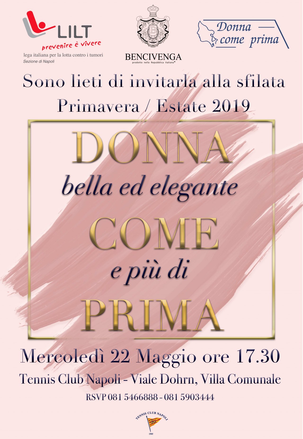 La particolarità del dèfilè e che l'Azienda Bencivenga Alta Sartoria oltre alle sue mannequin farà sfilare alcune signore di Donna come Prima (Associazione affiliata alla LILT Napoli di donne operate al seno nata nel 1992) per dimostrare che oggi, grazie ai notevoli avanzamenti della diagnostica e della terapia, è doveroso ritrovare anche dopo un momento “particolare” la voglia di vivere per se e per gli affetti che ti circondano. A tal proposito sfileranno con le signore di Donna come Prima anche familiari a dimostrazione che una malattia importante colpisce essenzialmente il paziente ma contemporaneamente il mondo affettivo che lo circonda. DISPONIBILITA' FINO AD ESAURIMENTO POSTI